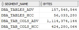 The size of DBA_TAB_COLS_HCC has increased by 50%! The updated rows for SYS and APEX_040200 are no longer compressed with HCC and reside in new blocks that are either not compressed at all or compressed with Advanced Compression.