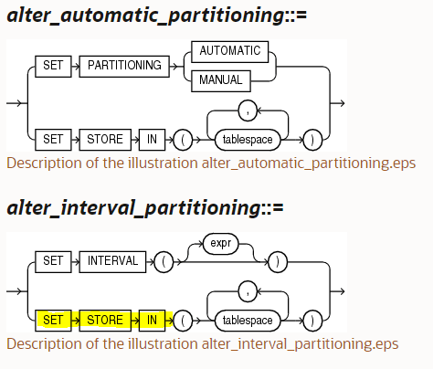 But there was still no reference to the STORE IN clause for interval partitioned tables in the alter_interval_partitioning section. It wasn’t until I decided to look at the syntax diagram that I found my answer: