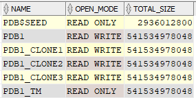 Within the same CDB as the “production” PDB1, I created the test master PDB1_TM and three read-write clones. You can also create the test master in another CDB, or even at a DR site using one of the Data Guard copies, but for this I wanted to keep it simple for the first test. After all the test master and clone provisioning was done, the CDB had essentially four copies of the 500 GB production PDB1: