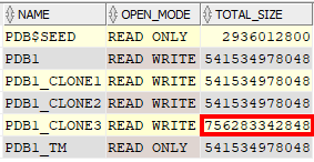 Each of the three snapshot clones are independent copies of the production PDB. Since they’re read-write, they can be modified independently of the other clones with no impact on the production PDB. What I did next was add 200 GB of table data to PDB1_CLONE3, and the total size of PDB1_CLONE3 increased by 200 GB as expected: