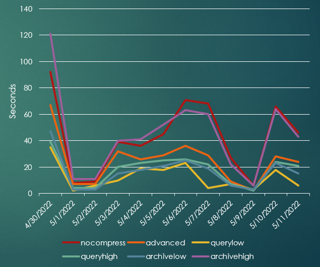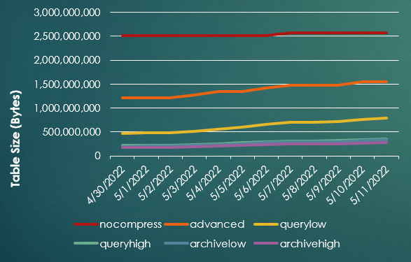 It’s possible I could have chosen a slightly better compression level — but it would be a tradeoff between table size and elapsed time. In this case, the elapsed time was a more important factor. Breaking down elapsed time between I/O and CPU as well as measuring the impact on the cell servers is also a topic for future research.