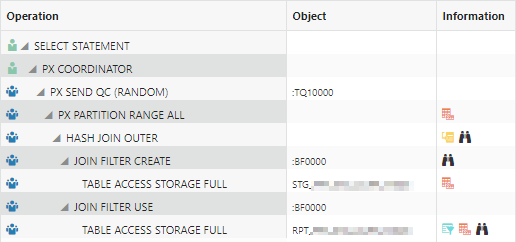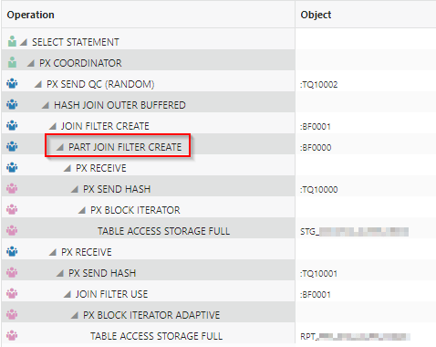 When the STG table is outer joined to the RPT table with that query using parallel query and offloaded bloom filters the plan looks reasonable: