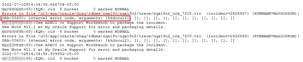 Within the last year under a recent RU of 19c (approximately 19.13) an ORA-00600 started showing up in the alert logs. I say “approximately” since the developers can’t say quite when the ORA-00600 started showing up, and the database alert logs in their environment are only kept for 60 days. But now, it was happening on a daily basis: