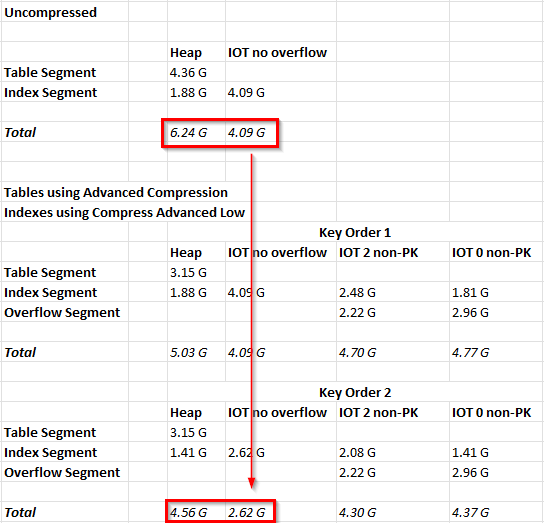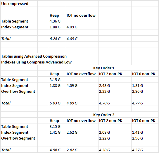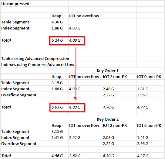 The uncompressed versions of the heap table and IOT show the advantage of putting both the table and the index in the same segment: