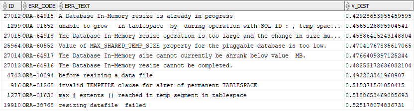 There is no exact error message with that phrase, much less most of those words. But the search is semantic: I’ll get the top 10 matches that are closest to my search string. The lower the V_DIST the closer the match. By default, the distance calculation (VECTOR_DISTANCE) uses the COSINE method.