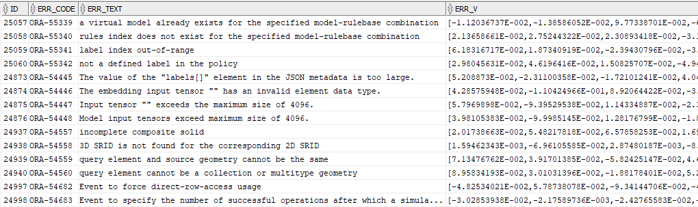 To test the model using semantic searches using text strings, I’ll need some sample data. This step creates a new table and loads 27,487 of the existing ORA- error numbers and error messages into a table that also contains a column (line 7) with a VECTOR datatype that numerically represents the attributes of the error message itself. Now that the model has been loaded, I use the VECTOR_EMBEDDING function in line 25 to populate the VECTOR column.