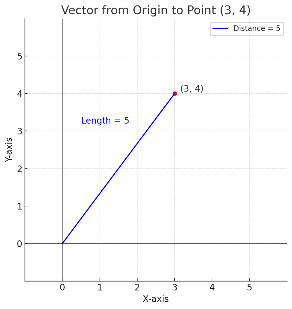 The Euclidean distance to [0,0] is sqrt((power(3,2)+power(4,2))) = 5. ChatGPT rendered this in a straightforward X-Y chart.