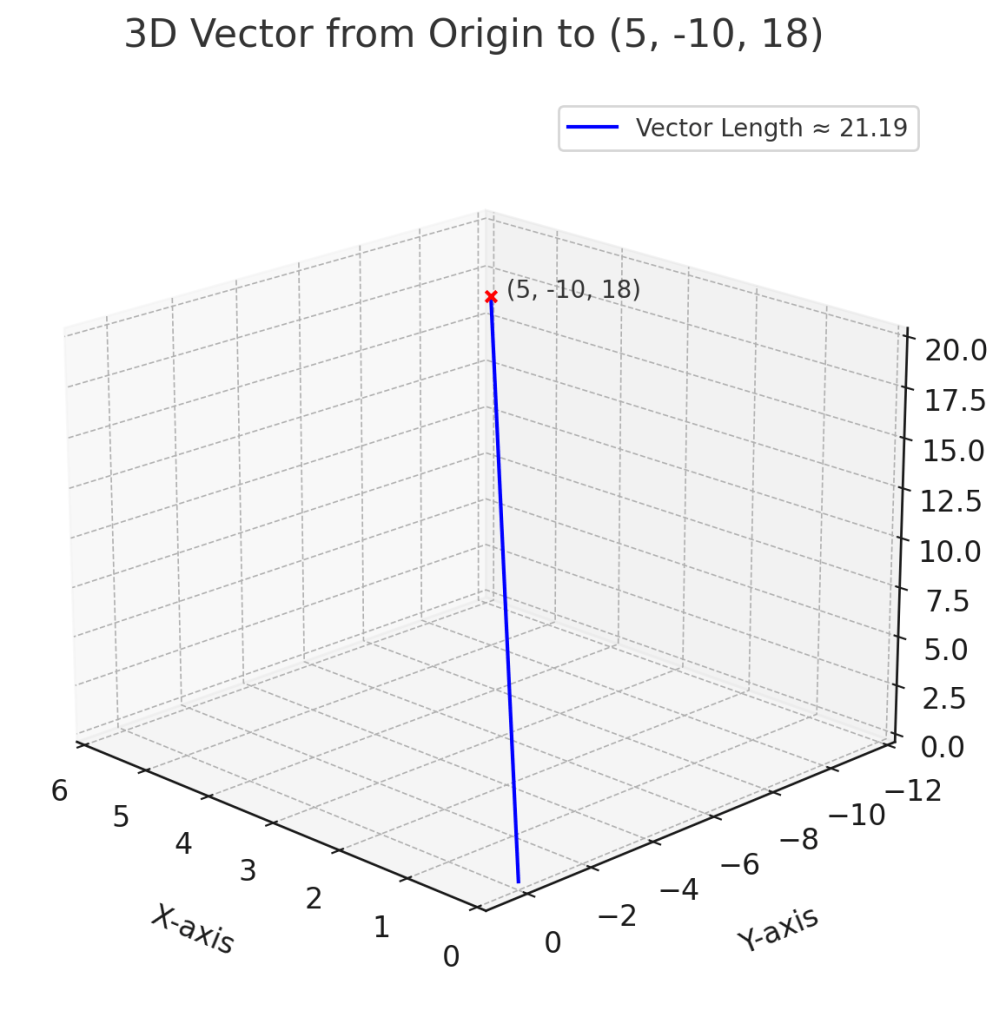 The result is a vector length of about 21.19. ChatGPT did a reasonable job of rendering this in 3-D, though it couldn’t seem to keep the Z-axis label visible no matter how hard I tried.